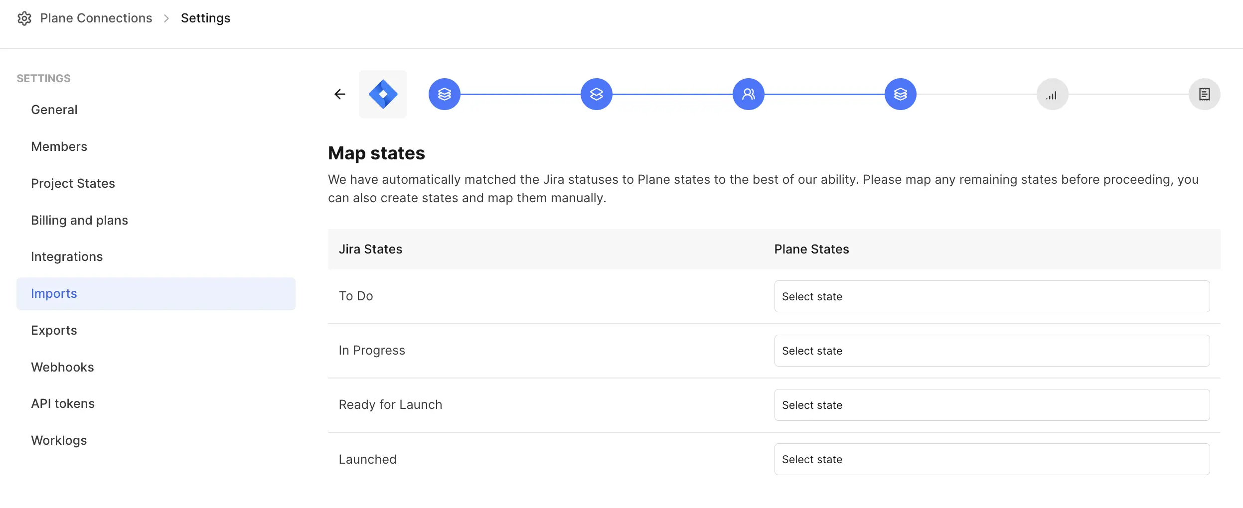 Choose the workspace and project in Jira from where you want to import data.::: info Work item types If you're on a paid plan (Pro or higher), issue types in Jira will be imported as work item types in Plane. On the free plan, issue types from Jira won't be imported. :::